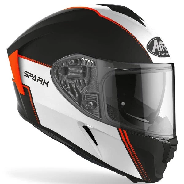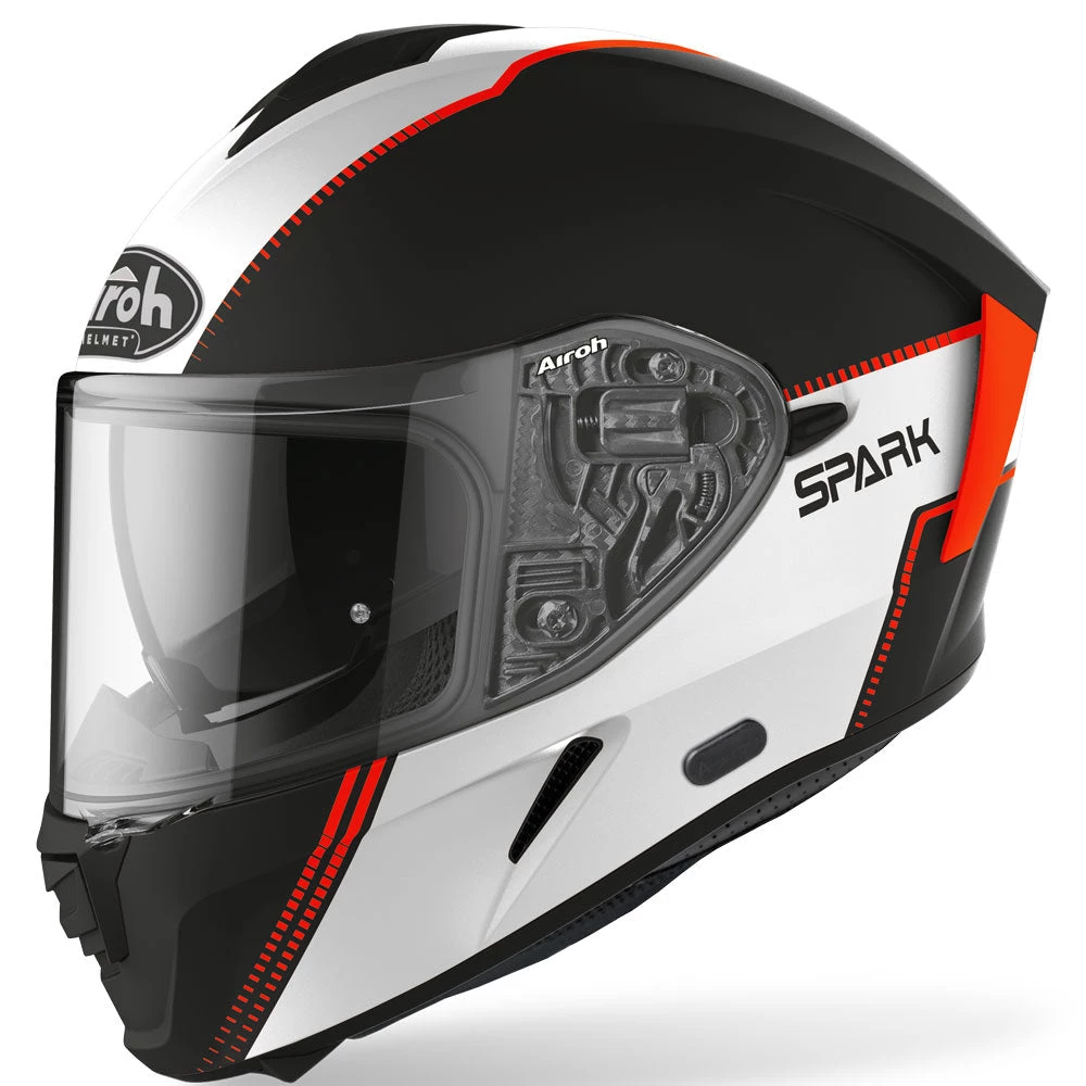 WITH THE NEW AIROH FULL-FACE MADE OF HRT (HIGH RESISTANT THERMOPLASTIC) AND ITS AGGRESSIVE AND AERODYNAMIC LINES, YOU WILL FEEL COMPLETELY COMFORTABLE IN EVERY SITUATION WHERE THERE’S JUST THE ROAD AHEAD OF YOU. ENGINEERED IN THE WIND TUNNEL AND DEVELOPED ON 2 DIFFERENT EXTERNAL SHELL SIZES, SPARK WILL IGNITE YOUR DESIRE TO JUMP ON YOUR BIKE, WHATEVER YOUR DESTINATION. EXTRA-WIDE VISOR, INTEGRATED SUN SCREEN VISOR, BLUETOOTH-READY, STOP WIND AND PINLOCK INCLUDED, COMPLETE THE TOP-OF-THE-RANGE HELMET.