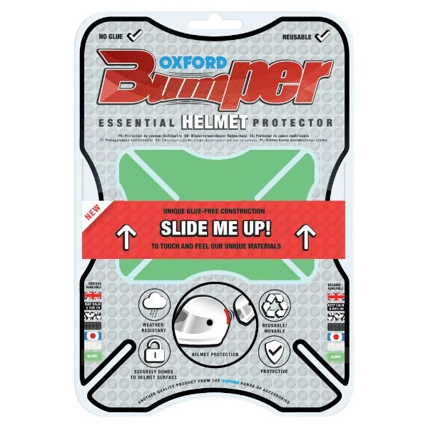 Avoid rider and pillion helmets coming together with an uncomfortable ‘thwack’ by using the innovative new Oxford Bumper helmet protector! These knocks are almost unavoidable when riding pillion, but if you attach a Bumper to the back of the rider’s helmet you can minimise the damage and discomfort. This unique product uses a carefully formulated blend of special materials to be extremely grippy without using adhesives. This means that you can take it on and off any number of times – either for re-positioning purposes or because you only want to use it when riding with a pillion. Choose from one of 7 quality designs to protect your helmets and look good in the process.