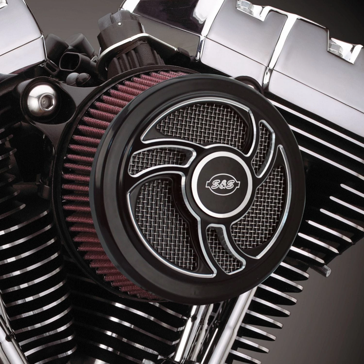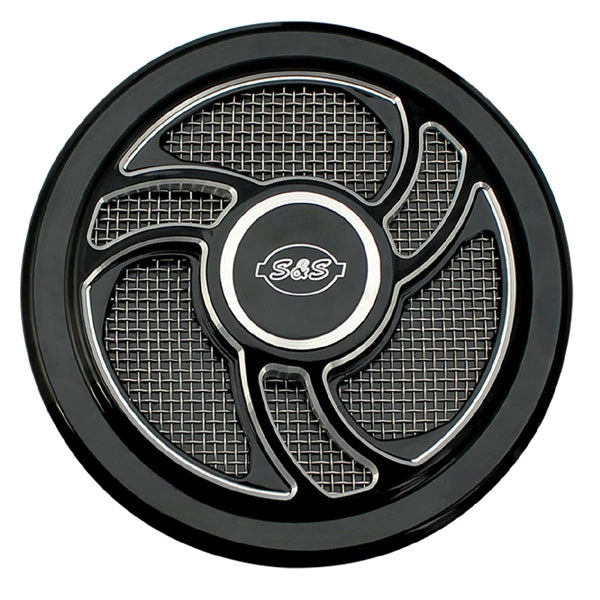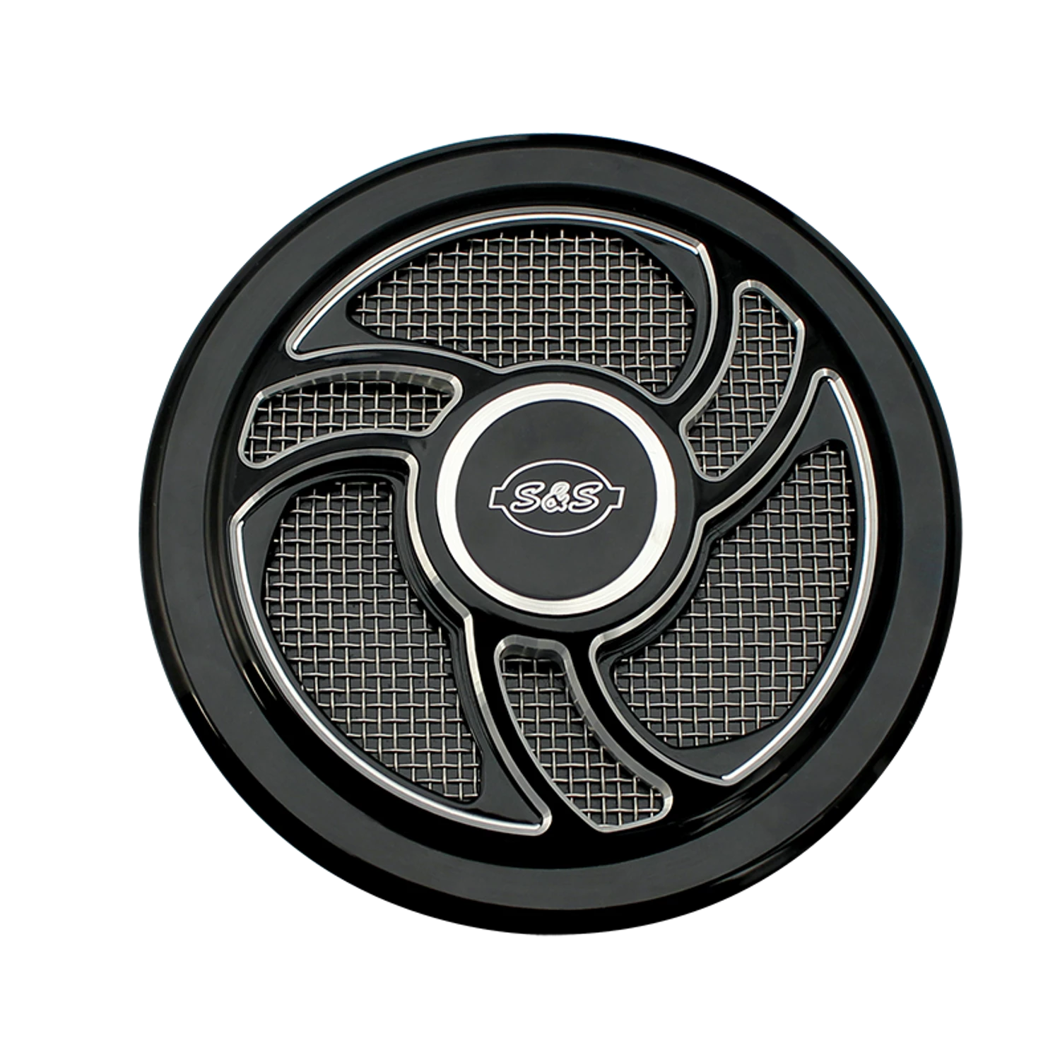 The Torker cover for S&S® Stealth air cleaners is CNC machined from billet aluminum, given a gloss black powder coat finish and is contrast engraved for a distinctive look. A metal screen behind the cut out pattern adds an attractive texture. The center mounting bolt is hidden behind a billet aluminum badge that simply plugs into the Torker cover.