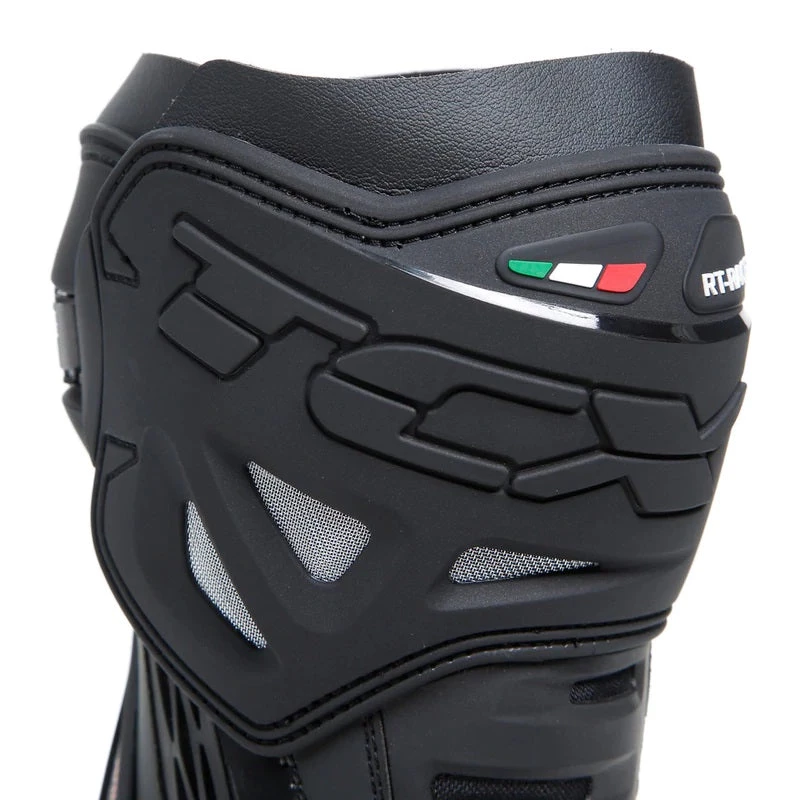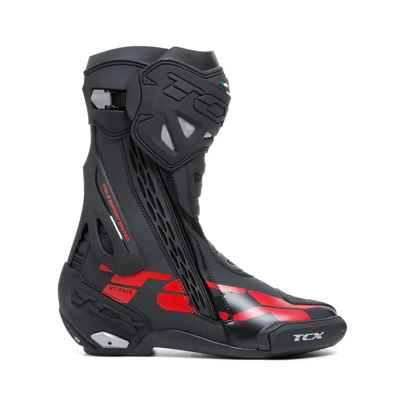 From the storied heritage of TCX’s racing line, the TCX RT-Race Boots are their most streamlined track boot to date. With a strong and lightweight microfiber construction, the TCX RT Boots maintain protection with a lighter, more comfortable feel. The toe slider, shift pad and closure strap are formed from polyurethane, which is used in conjunction with magnesium to form the heel slider and with iron mesh intake vents to create the shin plate. The over-injected front and side panels allow easy step-in, and the FFC (Fasten Fit Control) with internal laces joined to the boot lining results in a precise, secure fit that maximizes protection. In the ankle, the TCX RT-Race Boots feature the DFC (Double Flex Control System) to allow lateral and longitudinal movements only within physiological limitations, while preventing excess torsion and minimizing risk of injury. For the track rider seeking Italian race boots without compromise in either ergonomics or protection, the TCX RT-Race Boots are an excellent choice.