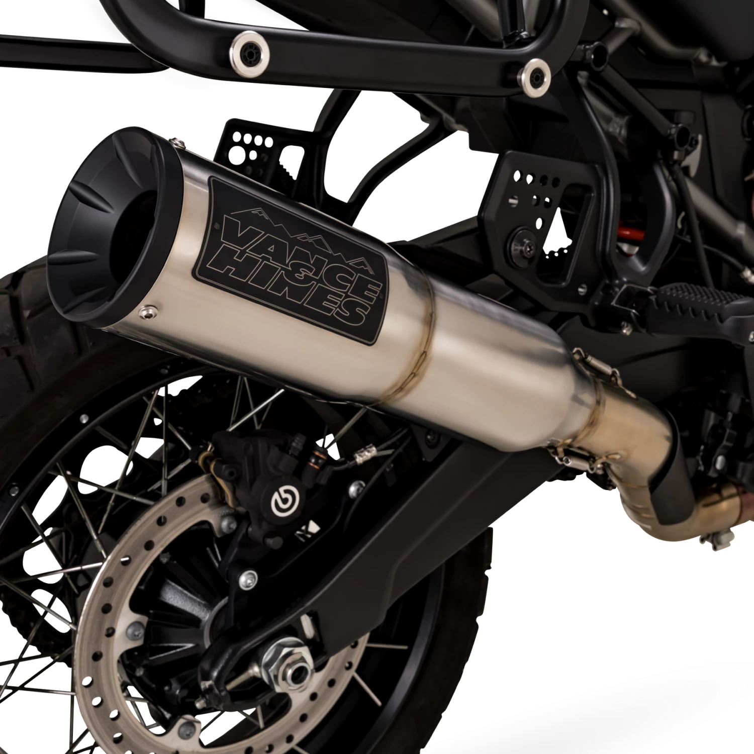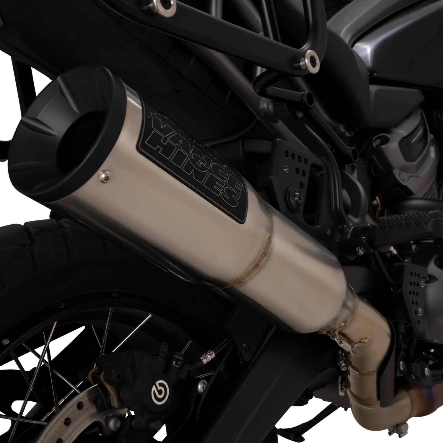 The Vance & Hines Adventure Hi-Output 450 delivers a strong increase in horsepower and torque vs the bike’s stock Revolution Max exhaust system while reducing overall weight of the exhaust by nearly 6 lbs. The new rugged look is a familiar round, stepped-style HI-Output canister, but with a new brushed finish which enhances the bike’s style over the stock black exhaust.